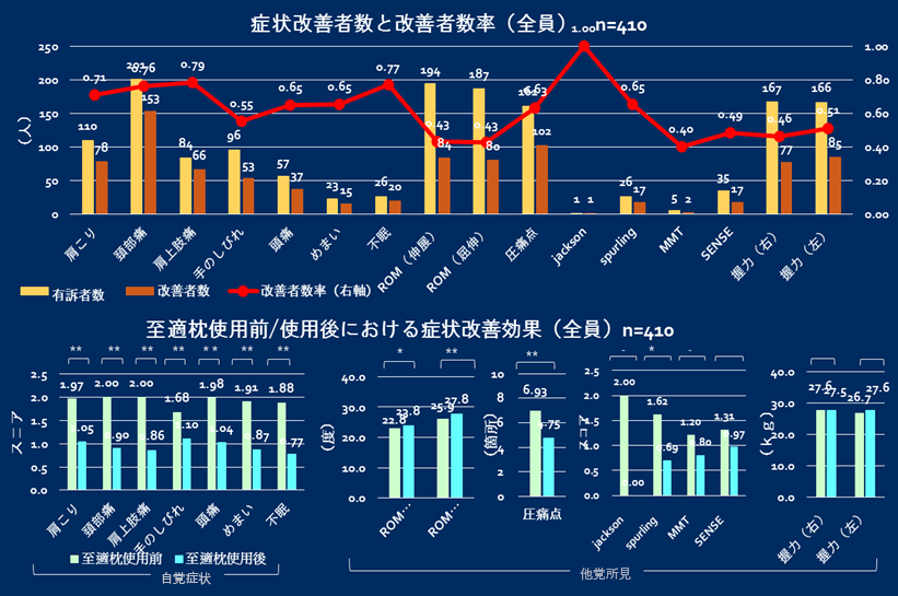 至適まくらを使用して経過観察した410例(男195/女215)、14〜93歳(平均50.5歳)の患者様を対象に調査しました。