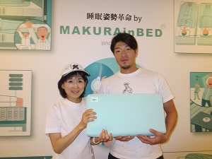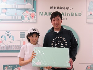 首枕をつけた石川歩投手と、当社の枕診断士の記念撮影のお写真です。