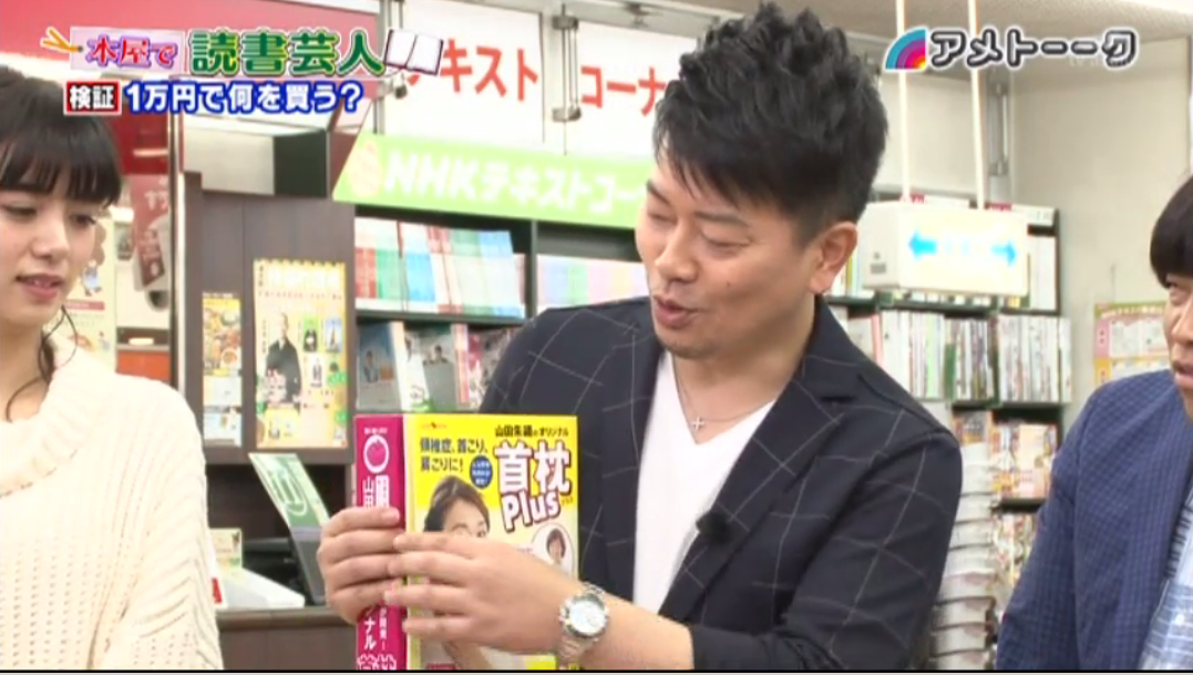 テレビ朝日「アメトーーク!」で首枕Plusが紹介されました! Tweet テレビ朝日『アメトーーク!』2016年11月10日(木)放送「本屋で読書芸人」にて、雨上がり決死隊の宮迫さんに山田朱織枕研究所代表、山田朱織が監修した首枕Plusをご紹介頂きました。 本屋で読書芸人という番組企画の中で、本屋さんで1万円あったらどんな本を買うか?というコーナーの中で宮迫さんが選んだ4冊の中の1冊として首枕Plusをお選びいただきました。ありがとうございました。 こちらは番組の画面キャプチャです。 首枕Plusの紹介の動画はこちらでご覧ください。 首枕をどんな時に使うか、ルーツ、メカニズム、使用上の注意などは下記にてまとめておりますので、ご覧頂ければ幸いです。 首枕で肩こり解消、頸椎症にも