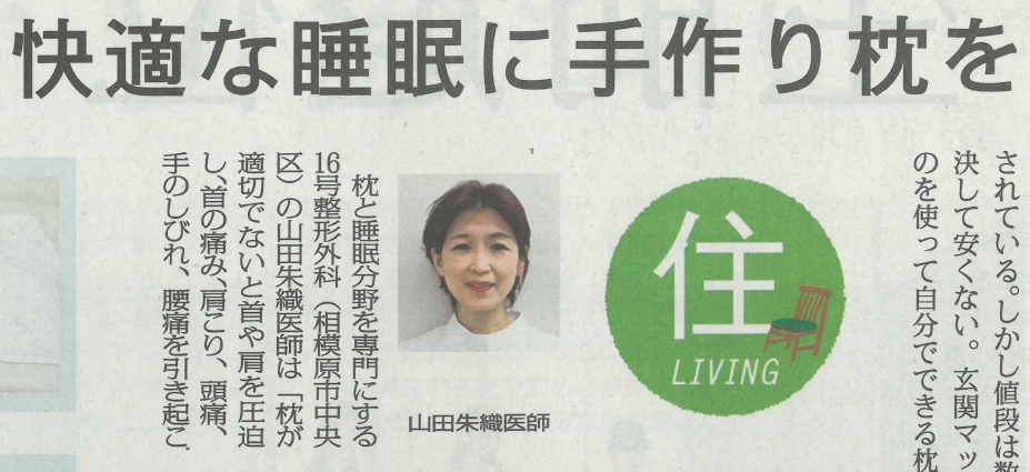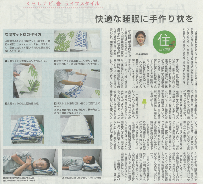 毎日新聞「くらしナビ」にて玄関マット枕の作り方が紹介されました Tweet 2016年8月9日(火)毎日新聞朝刊「くらしナビ」のコーナーにて山田朱織枕研究所の玄関マット枕が紹介されました。 「快適な睡眠に手作り枕を」ということで、山田朱織のインタビューと、手作りの枕の作り方が写真付きで紹介されております。ぜひご覧ください。 毎日新聞のネット版でも紹介されております。 毎日新聞「快適な睡眠に手作り枕を」 手作り枕(玄関マット枕)の作り方は当社のホームページでも動画にて詳しくご紹介しております。 こちらもよろしければご覧ください。 自宅でできる手作り玄関マット枕