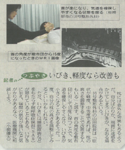 本日、日経新聞『NIKKEIプラス1』に山田朱織院長が掲載されました! Tweet 本日2/13(土) 日経新聞 『NIKKEIプラス1』 に16号整形外科院長、山田朱織枕研究所代表、山田院長が掲載されました。 「ぴったり枕で極上の寝心地を」「いびき、軽度なら改善も」 『NIKKEIプラス1』 は、日経新聞が「くらしに役立ち、読んで楽しく」をコンセプトに土曜日だけ別刷り発行している新聞です。 どうぞよろしくお願いします。