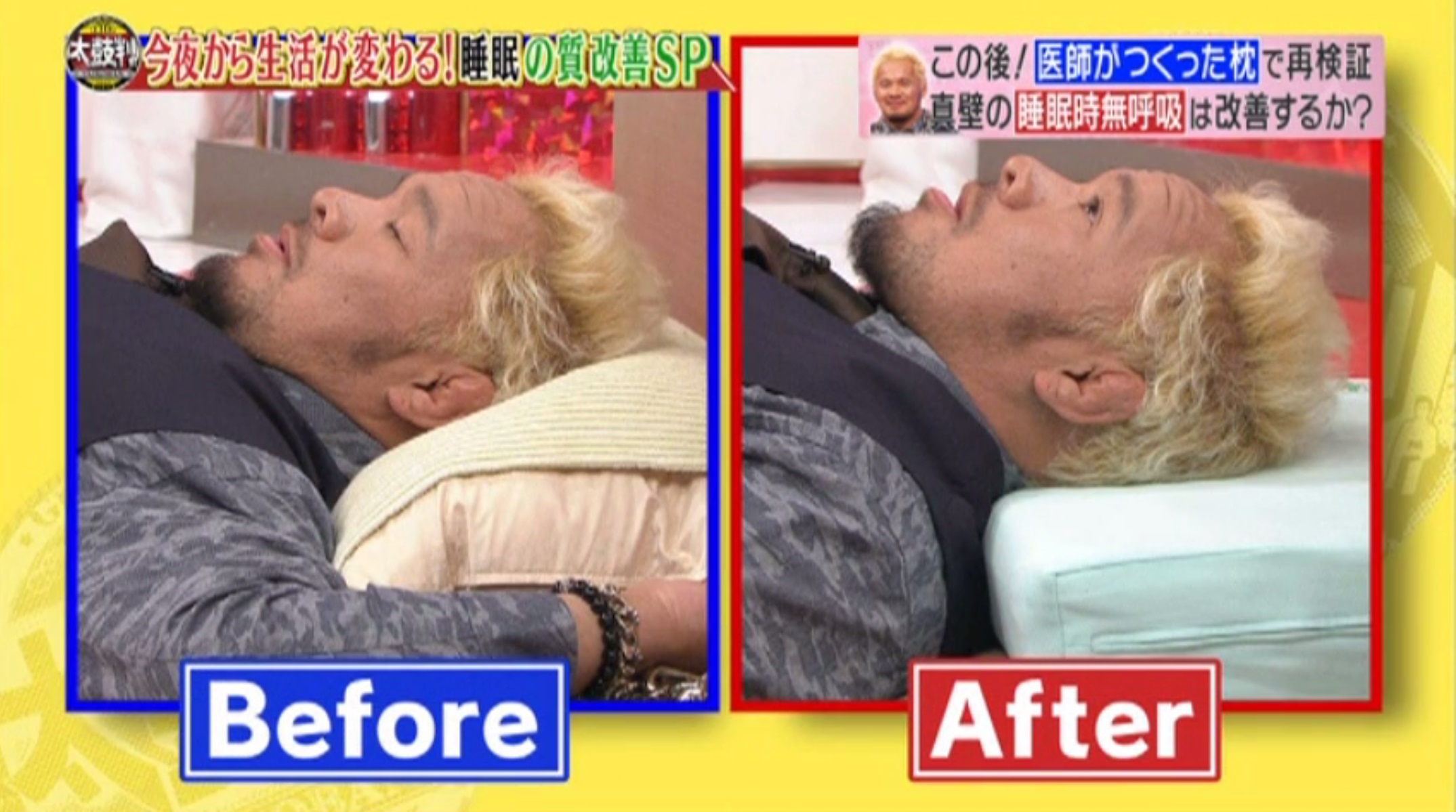 真壁刀義様にはその後、整形外科枕をご愛用いただいておりまして、久々に「あぁ寝れたな」という感じとコメントいただきました。ありがとうございます。データでも低呼吸、無呼吸の時間が3割減少したとご紹介いただきました。