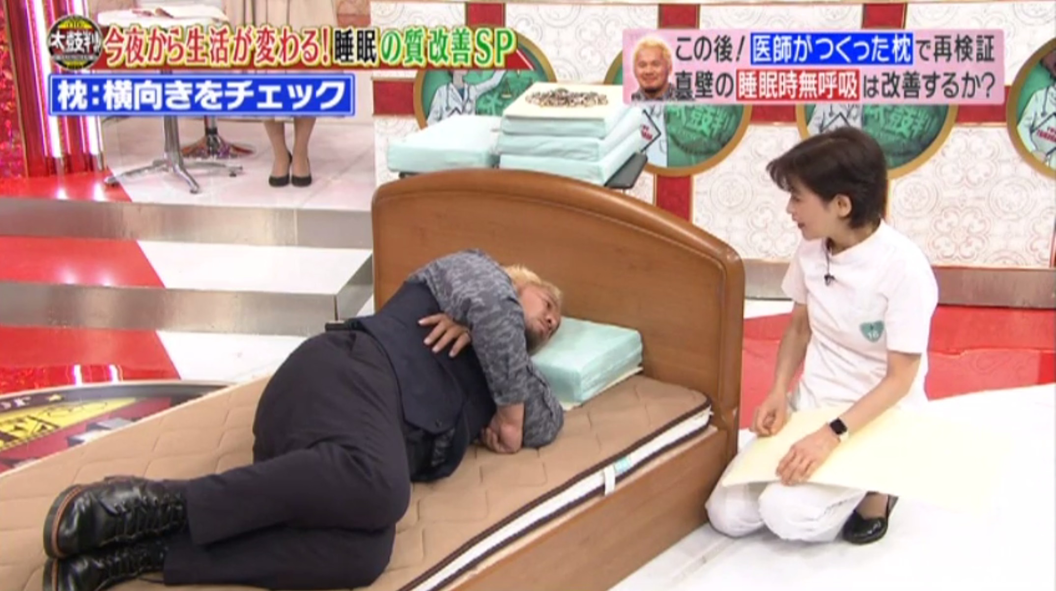 スタジオでは整形外科しきふとんを使って、真壁刀義様に整形外科枕の計測を行わせていただきました。