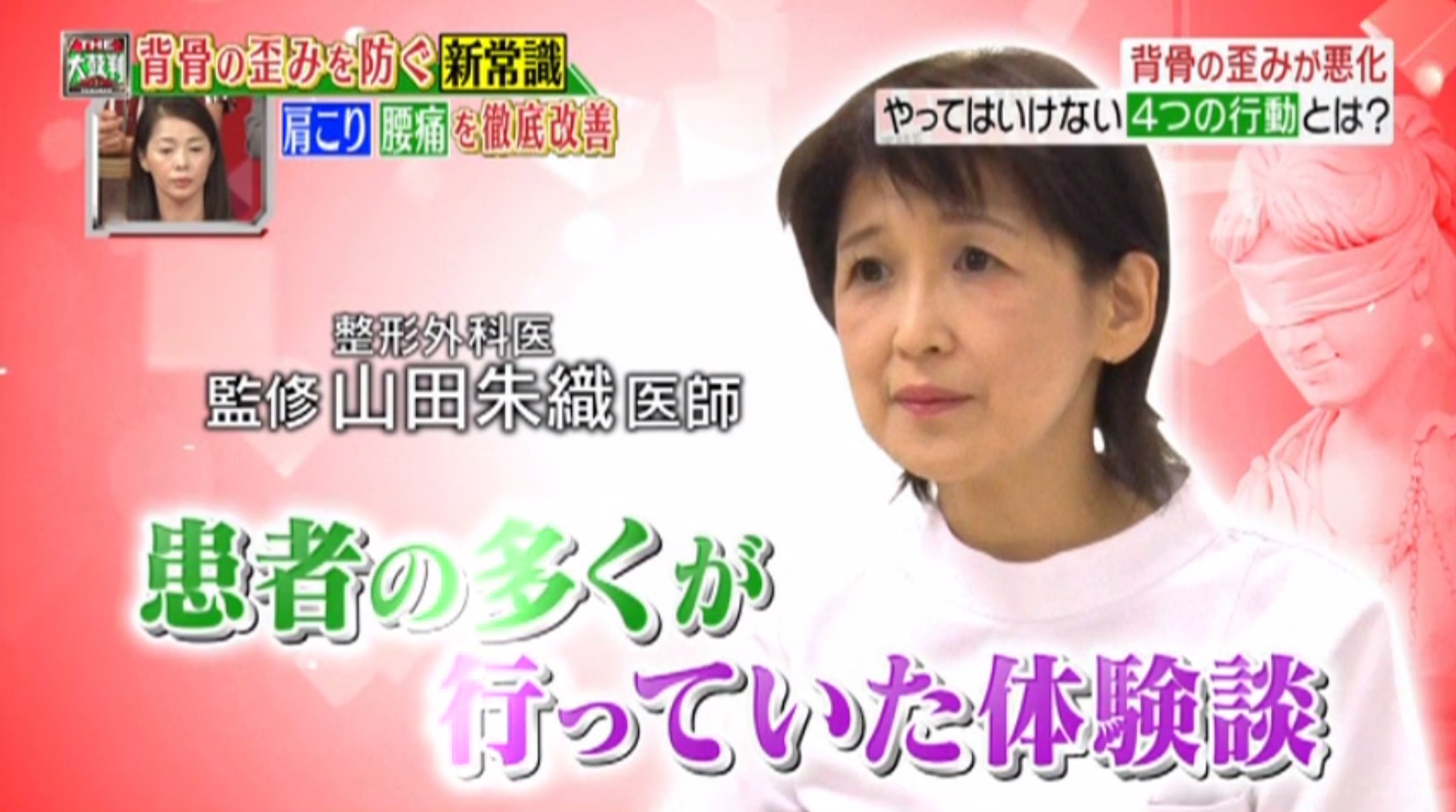 今回のテーマは、そんな“背骨のゆがみ”に関する予防と改善策として、自宅で簡単にできるセルフチェックや食べ合わせなどをくまなく紹介すると共に、背骨に関する巷のウワサやギモンについても医師団が徹底回答!是非ご覧下さい!