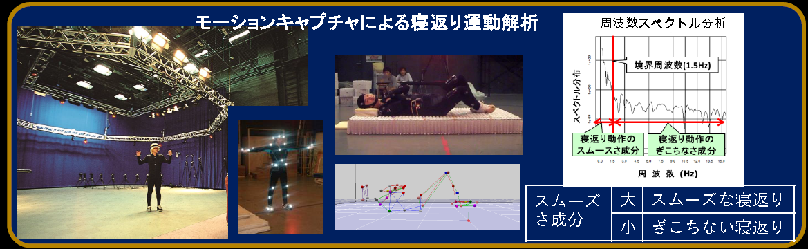 ・「寝返り」の研究はリハビリテーション医学と睡眠医学の2つの分野で散見されるが、そのとらえ方や解析方法には大きな差がある。前者では寝返りを覚醒時の「体位変換」や「回転動作」ととらえ運動解析が主である。一方後者では寝返りを睡眠中の「体動」とくに体幹四肢に及ぶ粗大な動きととらえ、生理学的解析(脳波や筋電図等)が主である。我々は覚醒時に最もスムーズな回転動作ができる枕調節を行うことで、就寝中に生理学的にも至適な体動(寝返り)ができるのではないかと仮説を立てている。しかし寝返りのメカニズム等が解明されていないため、本研究では第1歩として寝返りを頭と体に分けて回転角度を定義し観察し、特徴点を定量化し寝返りの基礎評価を示した。