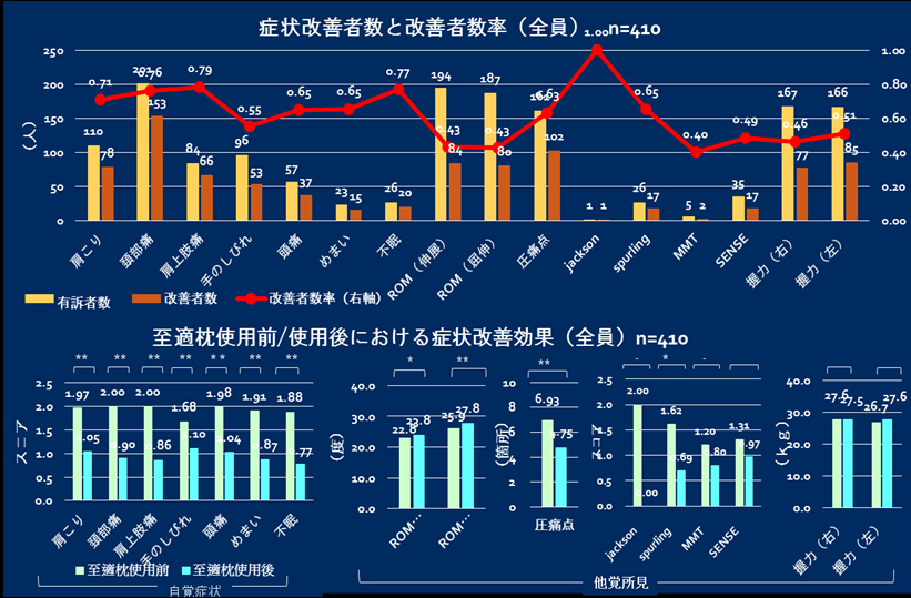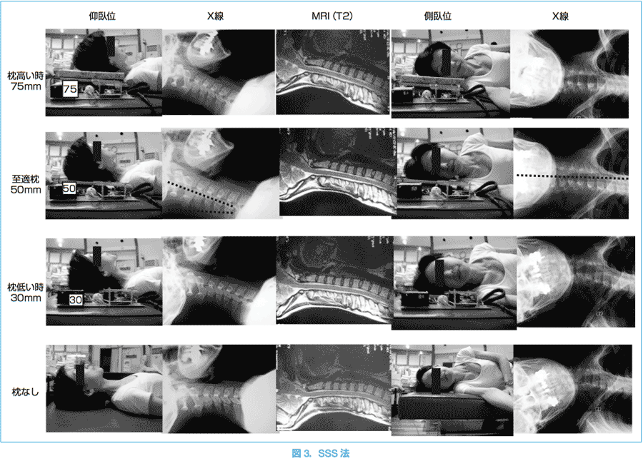 マクラの高さの調整方法(SSS法)」によって調整された枕を使用すると、頸部痛(首の痛み)、身体化症状(腰痛・背中のはり、筋肉痛・手足のしびれ、頭痛、息苦しさ・動悸、めまい・耳鳴り、疲労感・うつ状態、睡眠障害)が有意に改善された。と結論しております。