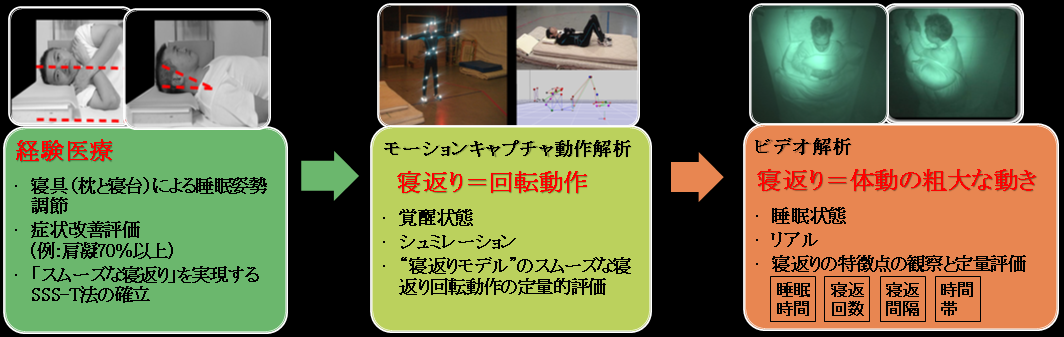 ・我々がこれまで覚醒時に回転動作として動作解析してきた寝返りについて、実際の睡眠中の体動として寝返りをビデオ解析した。先行する睡眠観察研究において一定の寝具条件はなく、選択した寝具(枕や寝台)が結果に影響を与える可能性も考えられる。そこで我々は臨床症状の改善を検証してきたSSS-T法で寝具条件を決定することで、就寝中の至適睡眠姿勢における観察を行った。