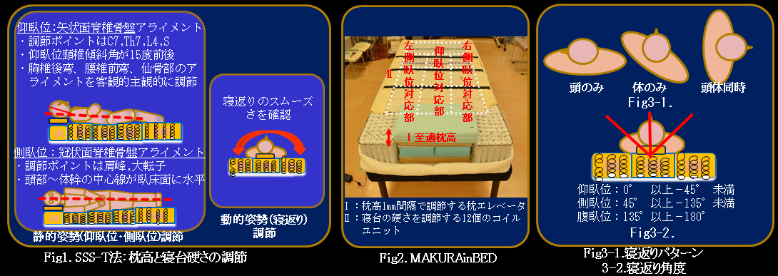 対象は健康なボランティア17名、平均年齢42.5歳、男性9名女性8名であった。SSS-T法(Fig1.)を用いて枕の高さと寝台の沈込を調節した。調節したMAKURAinBED(Fing2.)に寝てビデオ撮影を3日間施行した。目視にて頭と体、頭体同時の3つのパターンについて観察し(Fig3-1.) 、寝返りの角度から臥位姿勢を判定し(Fig3-2.)、 その時間と位置を記録し平均寝返り回数(T)と平均寝返り間隔(TI)を算出した。