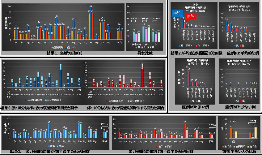 結果1.平均睡眠時間は6時間で、Tは頭24(5-56)回、体16(3-47)回あり、頭体同時Tは15(2-47)回であった。すなわち、頭のみの寝返り数は頭体同時Tより9回多く、体のみの寝返り数は頭体同時Tよりも1回多かった。頭体同時寝返りを男女比較すると、男性平均17回、女性平均13回で、男女間の有意差はなかった。
