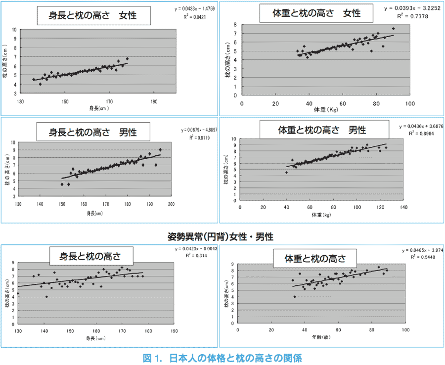 SSS法を用いて2284例の枕の高さを計測し体格の相関を調べた。非円背男949例で身長と枕の高さは相関係数(以下R2)R2=0.8119、体重と枕の高さはR2=0.8984、非円背女1205例で身長と枕はR2=0.8421、体重と枕はR2=0.7378と高い相関を示した。一方円背130例中男38例、女92例は体格と枕の高さに相関関係は認めなかった。これより円背は体格から枕の高さの推定は困難で、SSS法を用いて厳密な調節が重要である。本法によりPSおよび睡眠に関する愁訴が改善した。円背において適切な枕で寝返りを打ち熟睡を得ることは、日常生活を改善する重要な問題と考えられた。