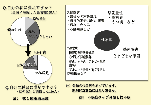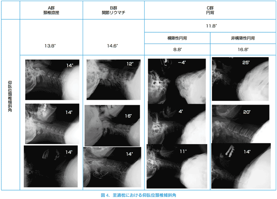 SSS法はPSを有意に改善した。円背が適切な枕で寝返りすることは睡眠障害の改善に重要と考えた。非円背2284例の枕の高さと体格の相関を調べたが男949例で身長と枕は相関係数(以下R2)=0.811、体重と枕R2=0.898、女1205例で身長と枕R2=0.842、体重と枕R2=0.737と高い相関を示した。円背130例男女の体格と枕に相関はなかった。円背は体格から枕の高さ推定は困難だが、構築性、非構築性に分類し仰臥位頚椎傾斜角を知ることが指標になると考えられた。