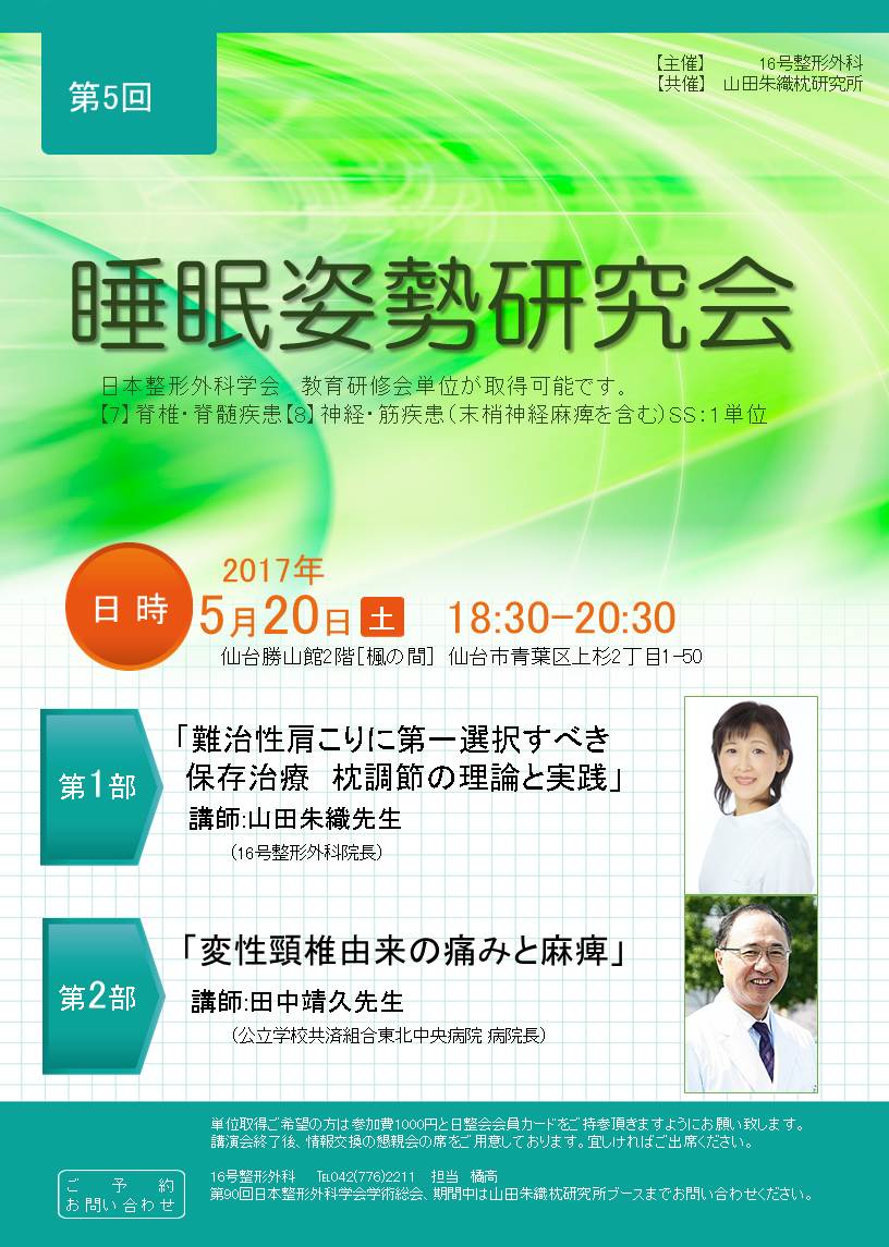 • 2023年2月27日に神奈川県相模原市で行われる「相模原整形外科Web講演会」において山田朱織医師が「難治性肩こり、頸部痛に対する枕治療についてー世界でまだ確立されていない新たな治療法ー」をオンライン(リモート)発表いたしました。